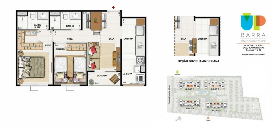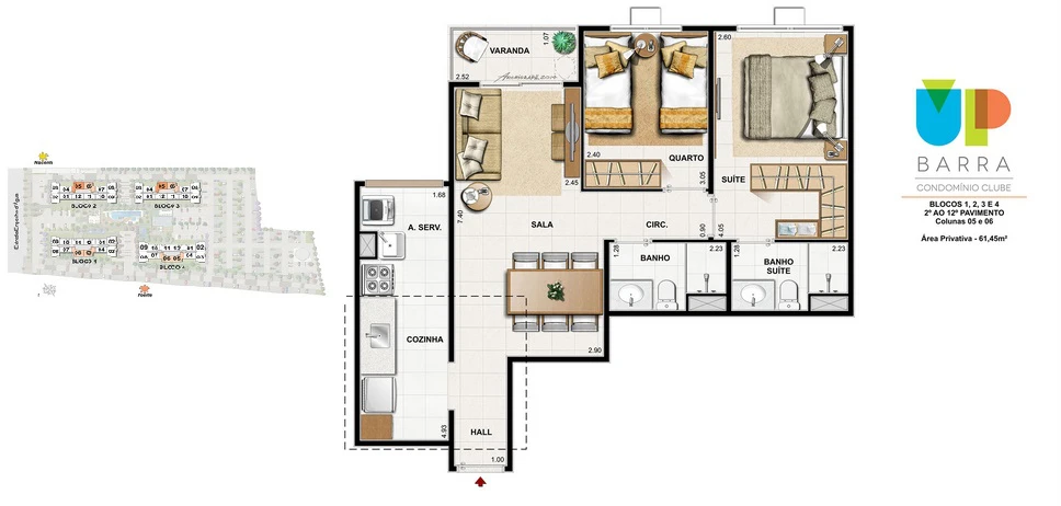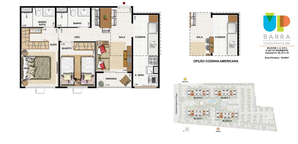 Apartamentos de 2 com 54m² até 61m²;
